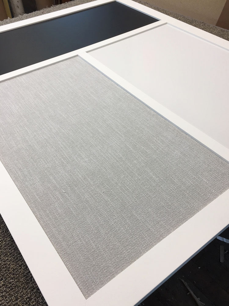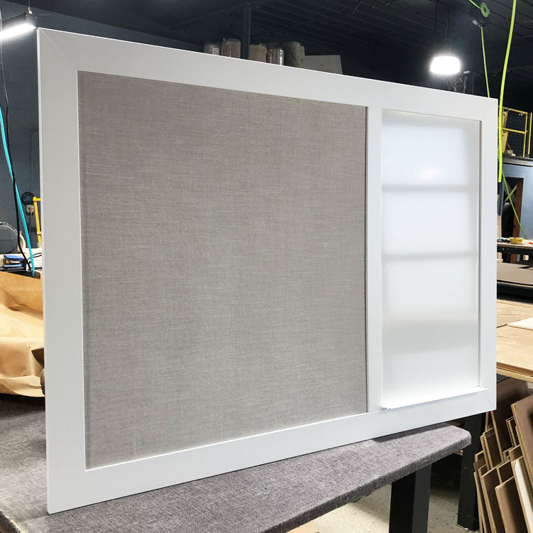 48" x 60" custom combo board with magnetic chalkboard panel on top - bottom section is divided into 2 equal panels - Ash Grey fabric on the left for pinning - magnetic dry erase on the right for writing - framed in 3" White Satin frame.