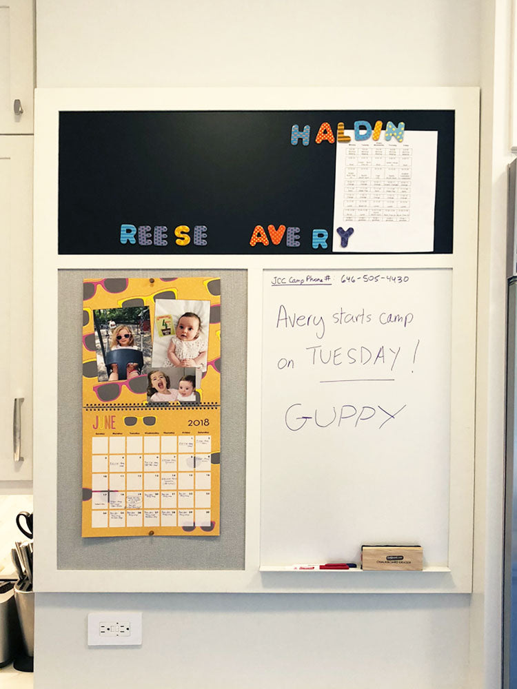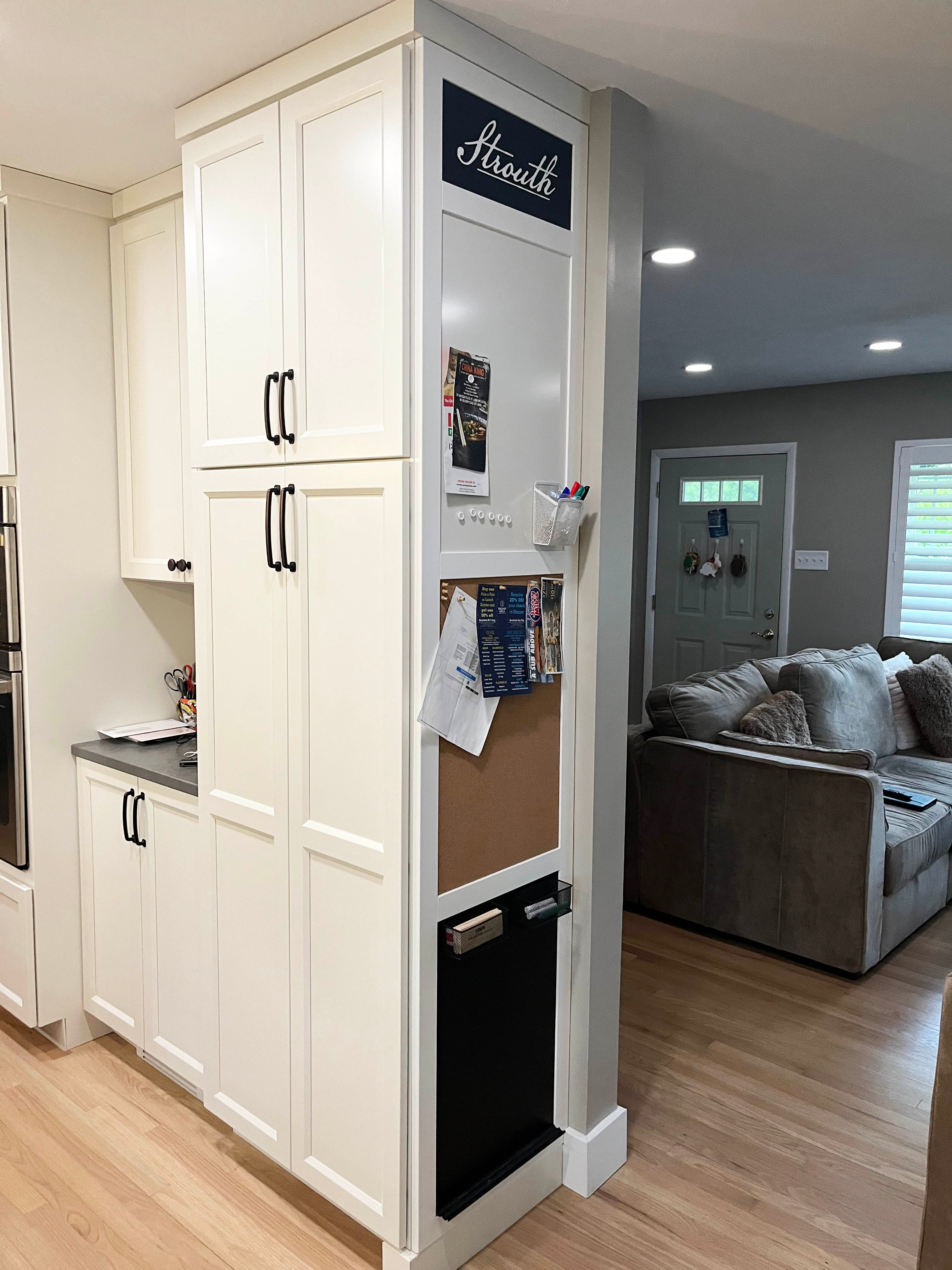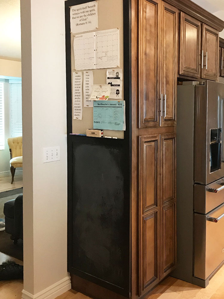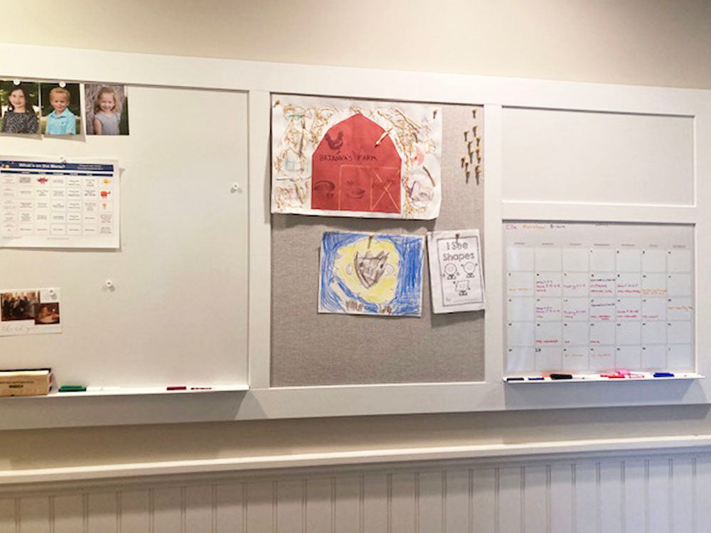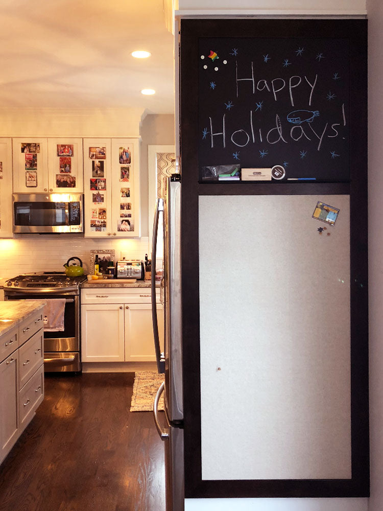 8 foot tall custom board for the side of a pantry cabinet - built with our 2" Satin White frame - divided into 3 panels of magnetic dry erase, cork and magnetic chalkboard with custom signage on top of customers name.