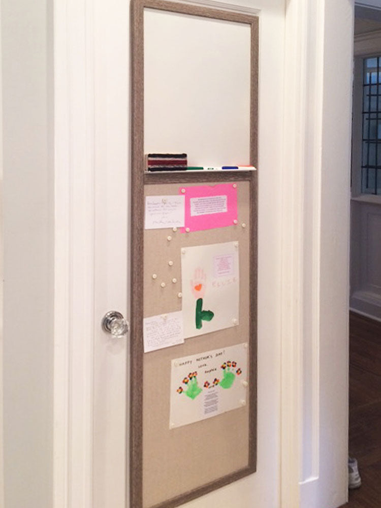 Custom combo board built for pantry door - top section is magnetic dry erase with tray - bottom section is fabric bulletin board - built with 1" Driftwood frame.
