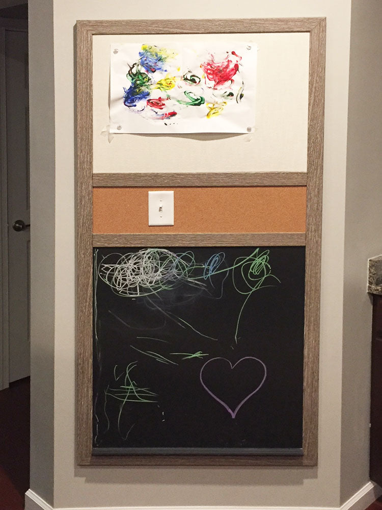 Custom combo board with magnetic dry erase panel on top and magnetic chalkboard below with tray - customer had a light switch in this wall so we added a cork panel in the middle that could be cut out - built with 2" Driftwood frame.