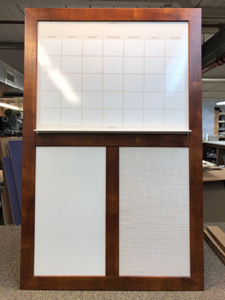Custom combo board with 24" x 18" dry erase calendar on top with tray - bottom section is divided into 2 panels - dry erase on left - fabric bulletin board on the right - framed in 3" Honey frame.