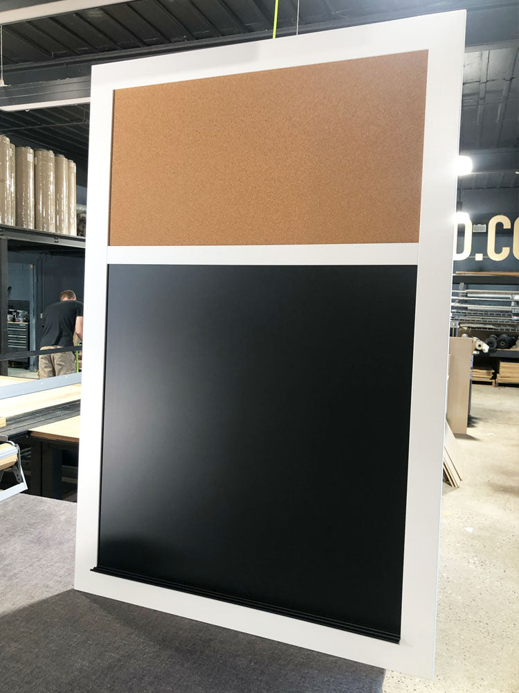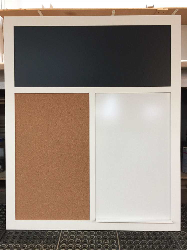 48" x 60" custom combo board with magnetic chalk panel on top - bottom is divided with cork panel on the left and magnetic dry erase panel plus tray on the right - framed in 3" White Satin frame.