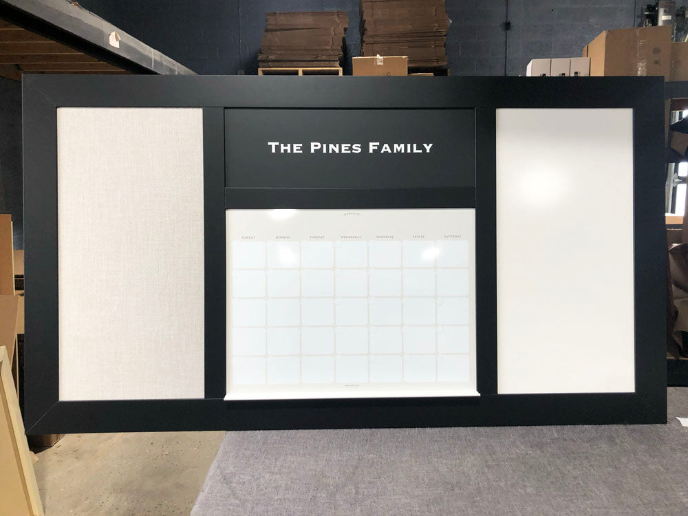 6 foot wide custom combo board with dry erase panel on the right and Ash Grey fabric panel on the left - middle section is 24" x 18" dry erase calendar with custom personalization above - framed in 3" Black Satin frame.