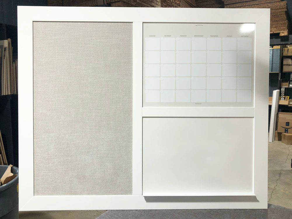 Custom combo board with dry erase calendar on top with cork panels on sides - bottom is divided magnetic chalk panel on the left and Smoke fabric bulletin board on the right - framed in 2" White Satin frame.