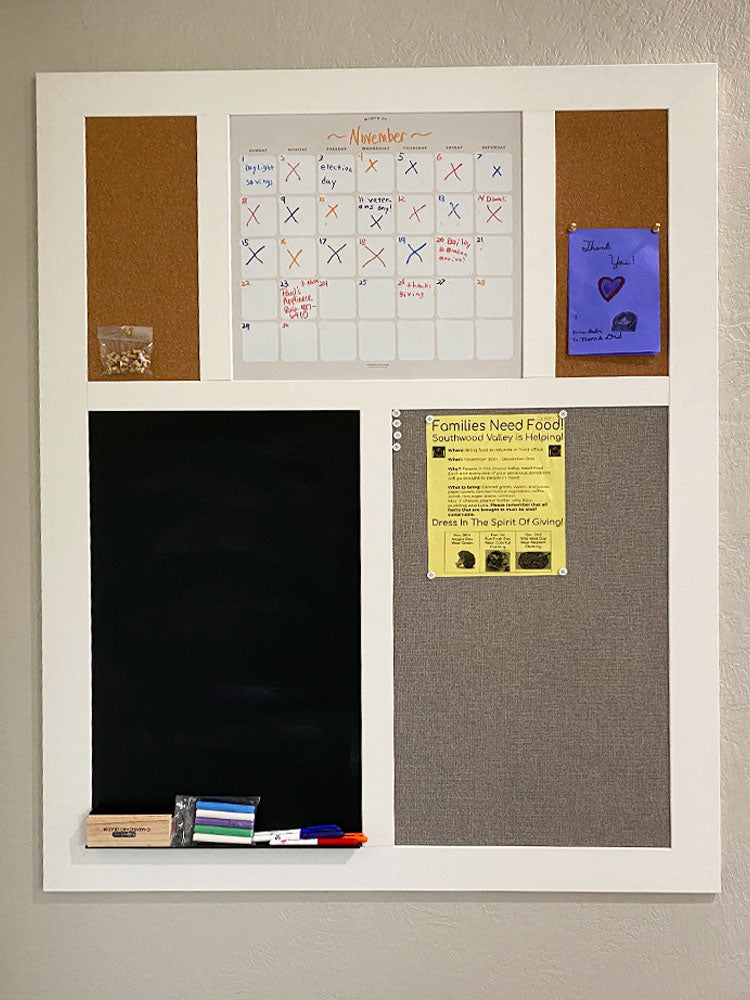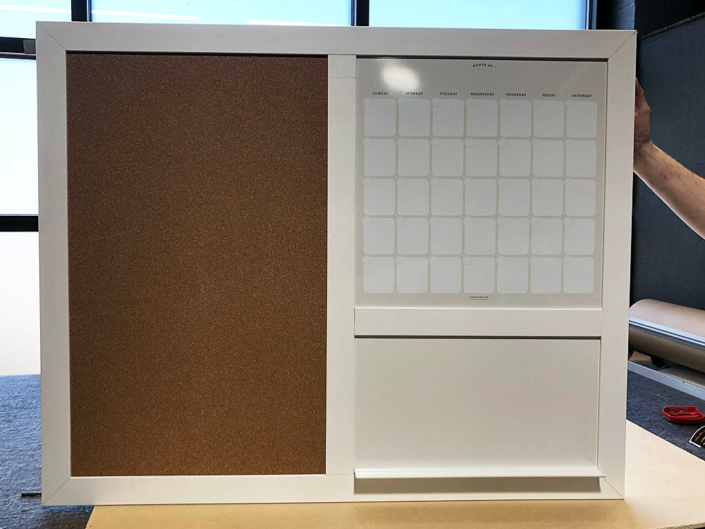 48" x 34" custom combo board with 18" x 18" dry erase calendar on top right with magnetic dry erase panel plus tray below - left panel is cork - built with 2" White Satin frame.