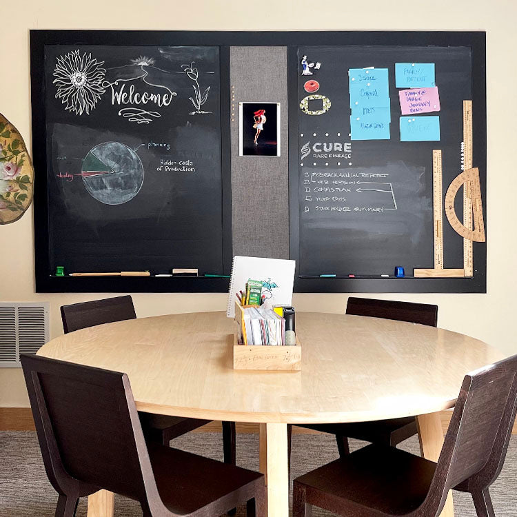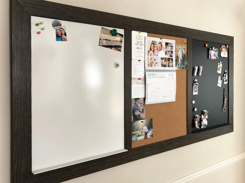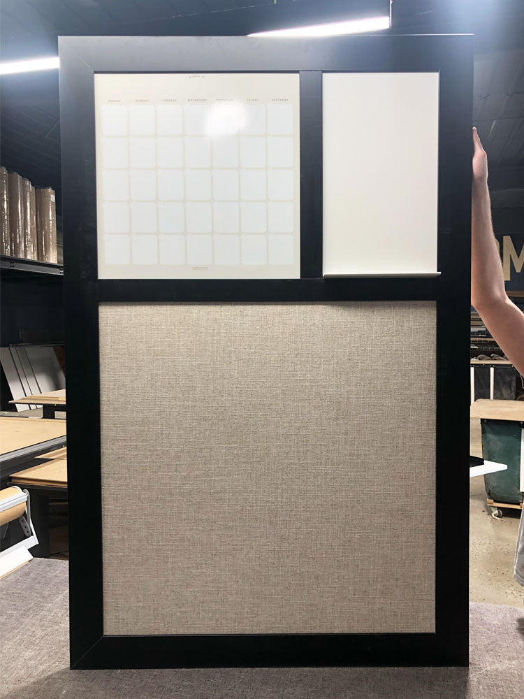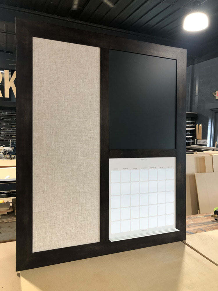 We build framed combo boards in any combination of cork or fabric panels for pinning - magnetic dry erase or chalkboard for writing - and dry erase calendars for keeping organized. Below are a few of the 1000's of custom combo boards we have built for our happy customers.