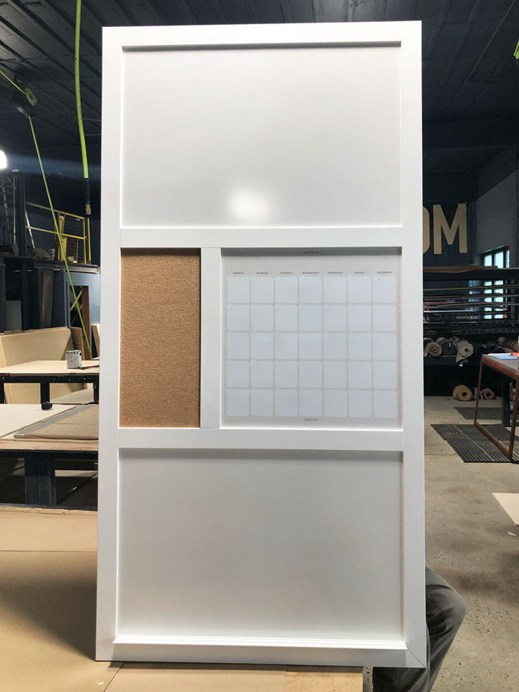 32" x 72" custom vertical combo board with magnetic dry erase panels on top and bottom with tray - middle section is 18" x 18" dry erase calendar with 8" wide cork panel for pinning to the right - framed in 2" Satin White frame.