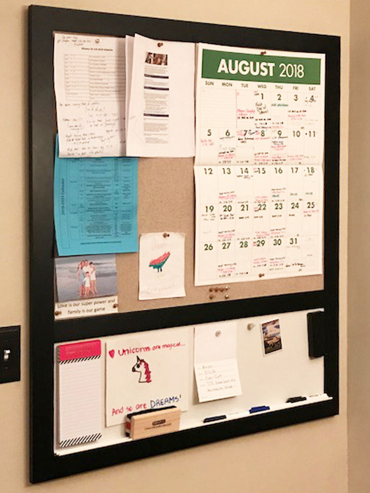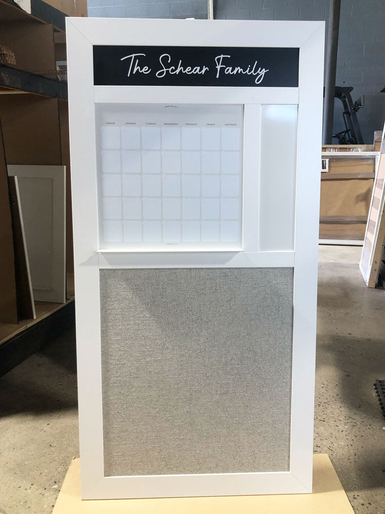 30" x 72" vertical custom combo board with custom personalization on top - dry erase calendar with narrow dry erase section to the right - bottom section is bulletin board with Ash Grey fabric - framed in 3" White Satin frame.