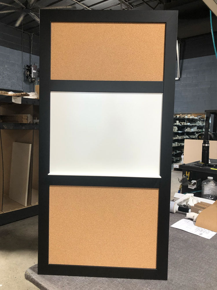 Custom combo board with cork panels on top and bottom - middle section is magnetic dry erase panel with tray - framed in 3" Black Satin frame.