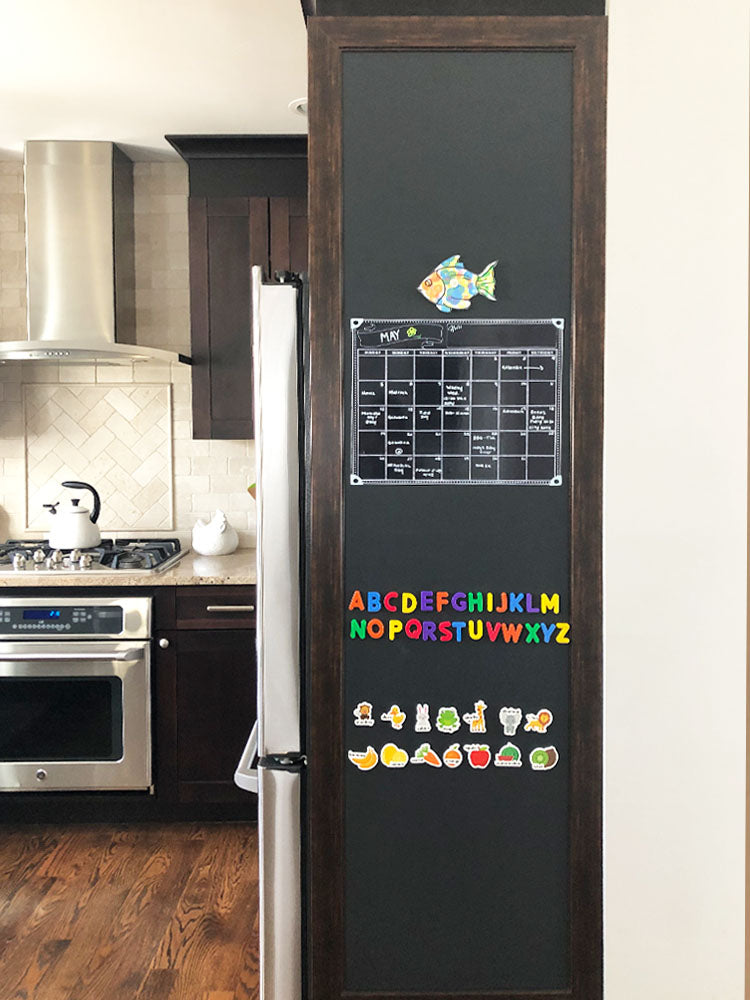 Custom magnetic chalkboard built for side of fridge - built with 2" frame.