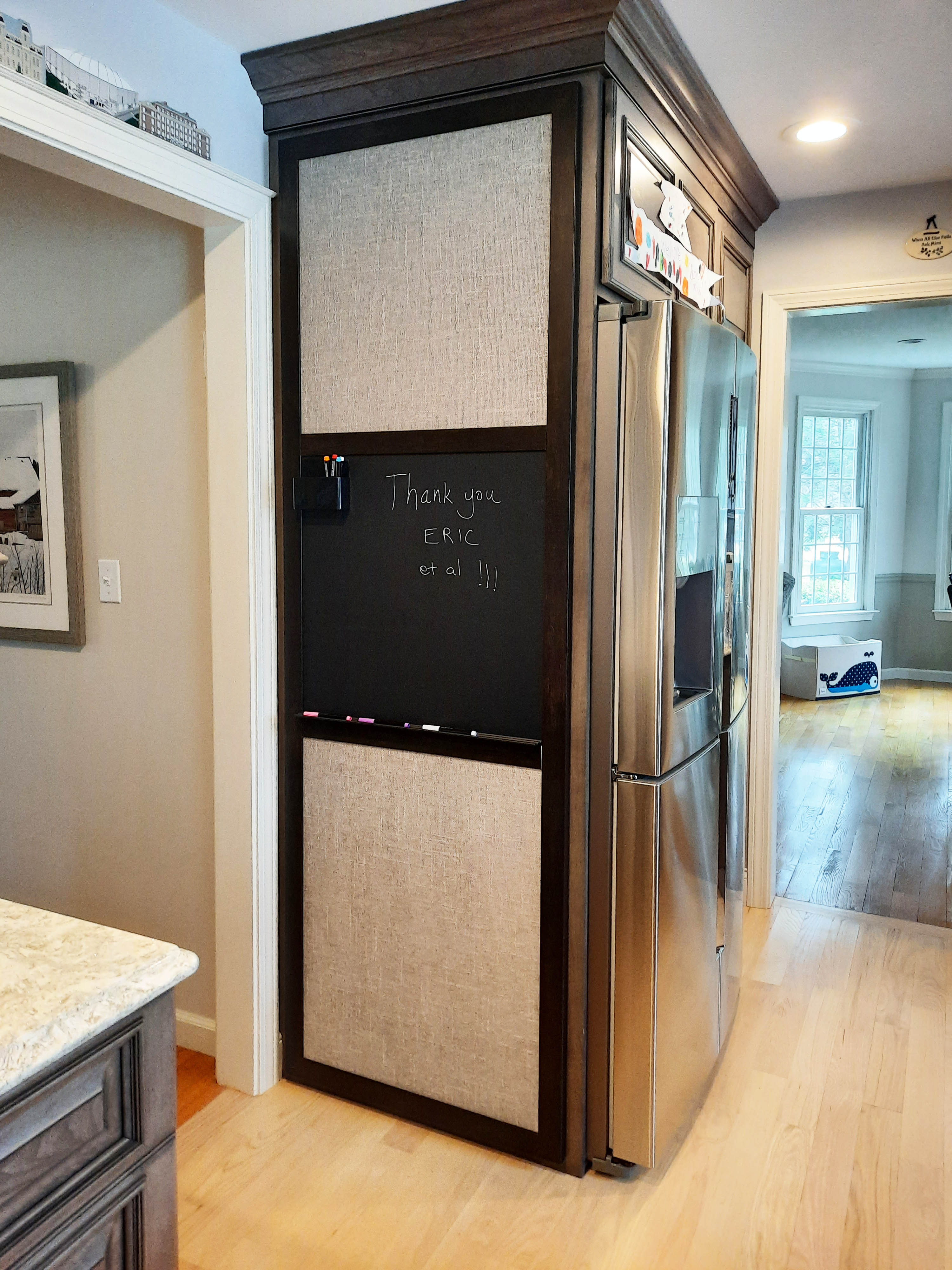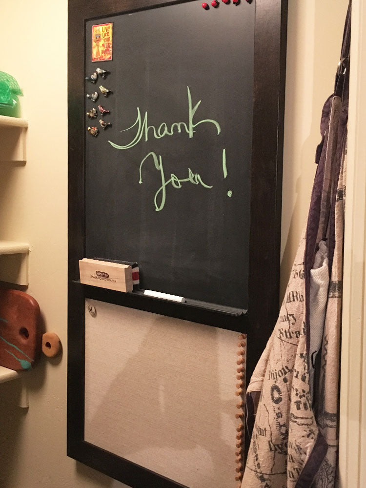 Custom combo board built for side of fridge - magnetic chalkboard on top plus tray with fabric bulletin board panel below - built with 2" Espresso frame.