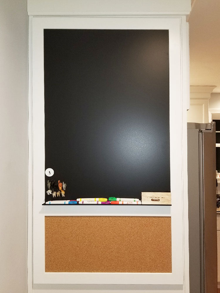 Custom combo board built for side of fridge - magnetic chalkboard on top plus tray with cork below - built with 2" Satin White frame.