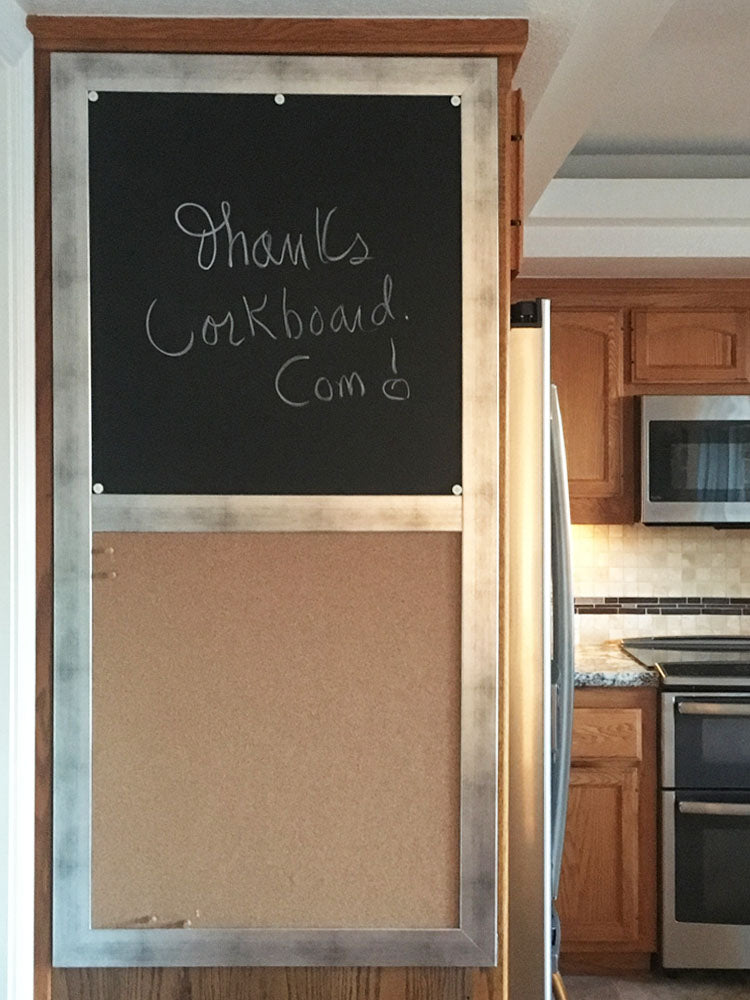 Custom combo board built for side of fridge - magnetic chalkboard on top with cork below - built with 2" Torino Silver frame.
