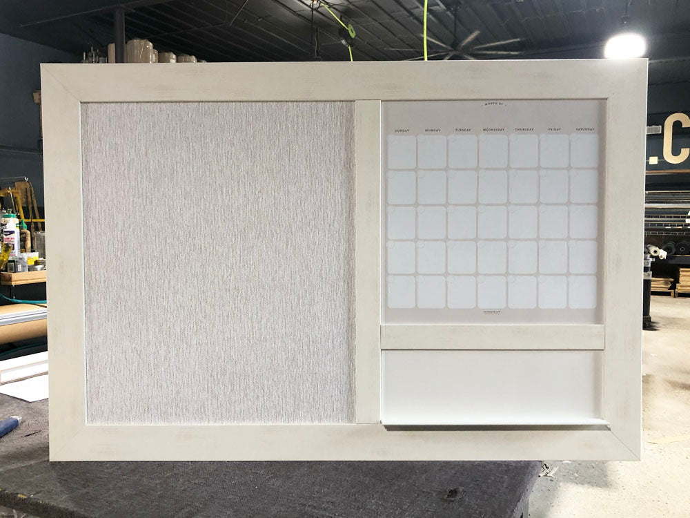 48" x 34" custom combo board with 18"x 18" dry erase calendar and magnetic dry erase panel below plus tray - left panel is magnetic panel covered in Birch Bark fabric - framed in 3" Driftwood White frame.