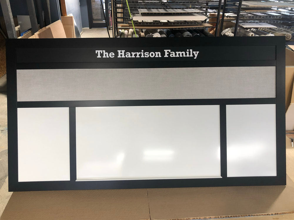 8 foot wide custom combo board with three magnetic dry erase panels - customer wanted one panel for their kids to use - one panel for the parents to use - and the middle panel for family notes and to-dos. Top section is chalkboard with custom personalization and below that is 10" tall magnetic panel covered in Ash Grey fabric - framed in 3" Black Satin frame.
