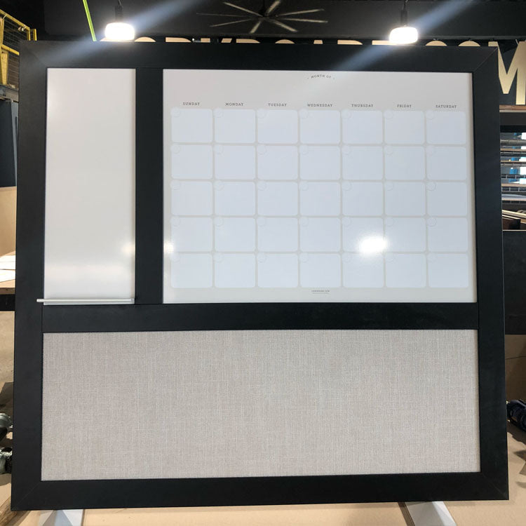 Custom combo board with 18" x 18" dry erase calendar on top left with magnetic dry erase panel to the right with tray - bottom section is fabric bulletin board - framed in 3" Black Satin frame.