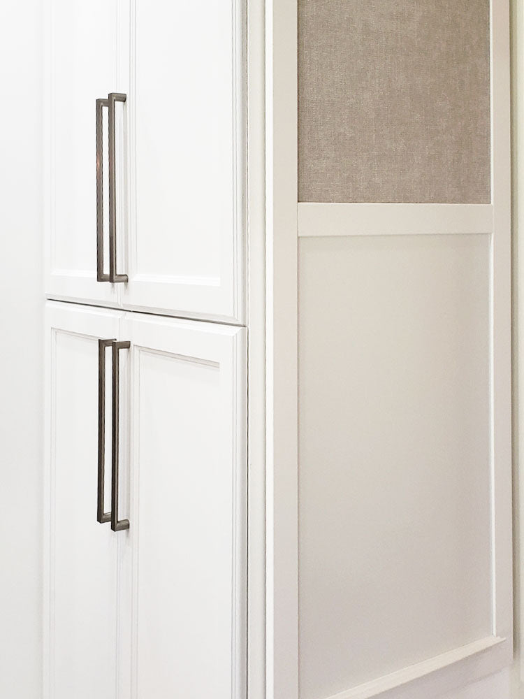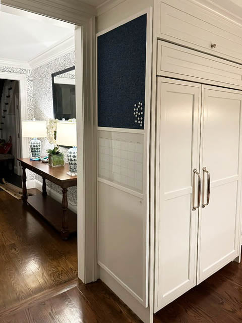Custom combo board built for side of pantry - Ash Grey fabric panel on top - magnetic dry erase panel below plus tray - built with 2" White Satin frame.