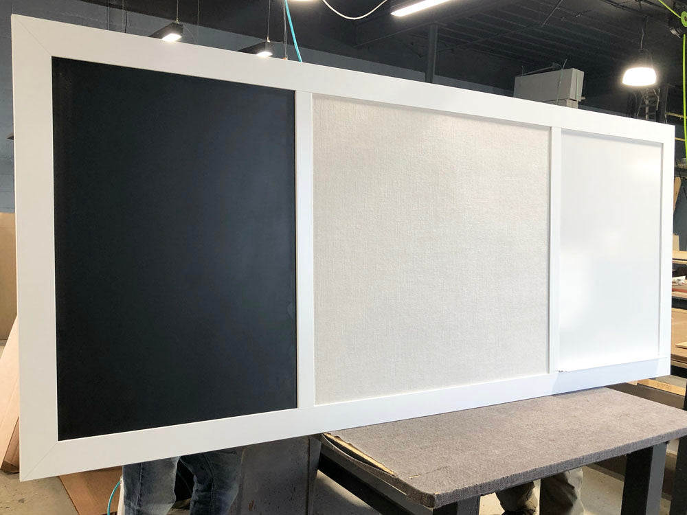 8 foot custom combo board with magnetic chalk panel on the right - Ivory fabric board in the middle and magnetic dry erase plus tray on the right - framed in 3" White Satin frame.