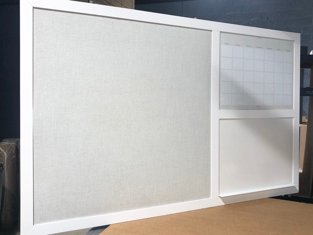 8 foot custom combo board with magnetic dry erase panel on the left - fabric bulletin board in the middle - right section is a second dry erase panel with dry erase calendar below plus tray - built with 3" White Satin frame.